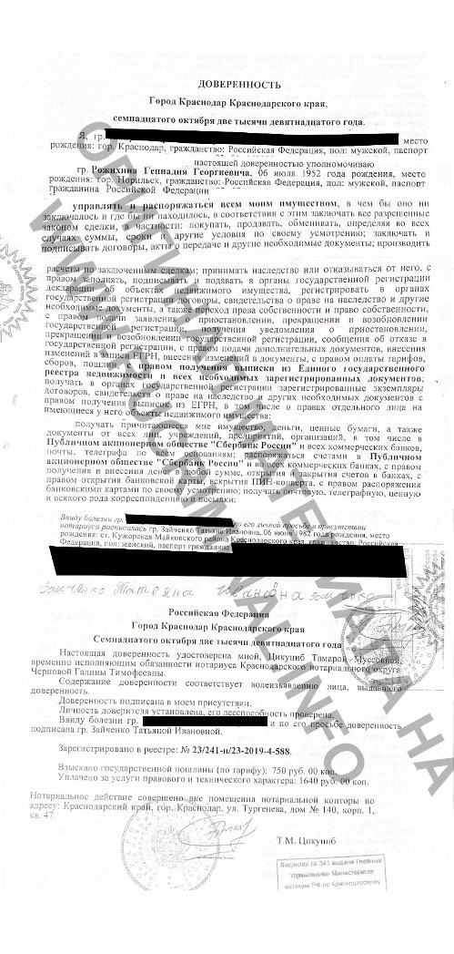 Few people find Chernova's love for money a secret. It is well known about its sale of "victories" at competitions to fill vacant notary positions in "fat" notarial districts (such as Krasnodar, Sochi, Anapa, Novorossiysk). So you can't think of a better place to draw up left-handed powers of attorney for the disposal of real estate and the savings of elderly victims. In addition, with such a "roof" it was possible to act calmly. It was in Chernova's office that powers of attorney were issued, certified by the personal seal of Galina Timofeevna, for the disposal of real estate and the savings of lonely old people.