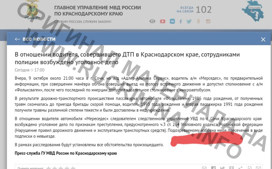 The driver has obviously already been "worked on" in this respect. He fully and unconditionally admitted guilt. But it looks like they worked not only with the driver. The Prosecutor's Office of the Krasnodar Territory on October 10 from 12.00 pm (the accident happened the night before) has already dotted all the I and constantly reports that the driver has admitted guilt, all the circumstances are clear, they say, and there is nothing to investigate. The Ministry of Internal Affairs of the Russian Federation went even further. The Internal Affairs Directorate for the Krasnodar Territory posted a press release about the accident and the initiated case, where at the end it was stated that "The suspect has been chosen a preventive measure in the form of a written undertaking not to leave the place." The press release was reprinted on its websites by the Central Asia Ministry of Internal Affairs of the Russian Federation, however, this phrase was simply thrown out. They decided not to disturb the public with the message that the driver who transported Sobchak, and who committed a fatal accident due to a gross violation of traffic rules, was left at large.