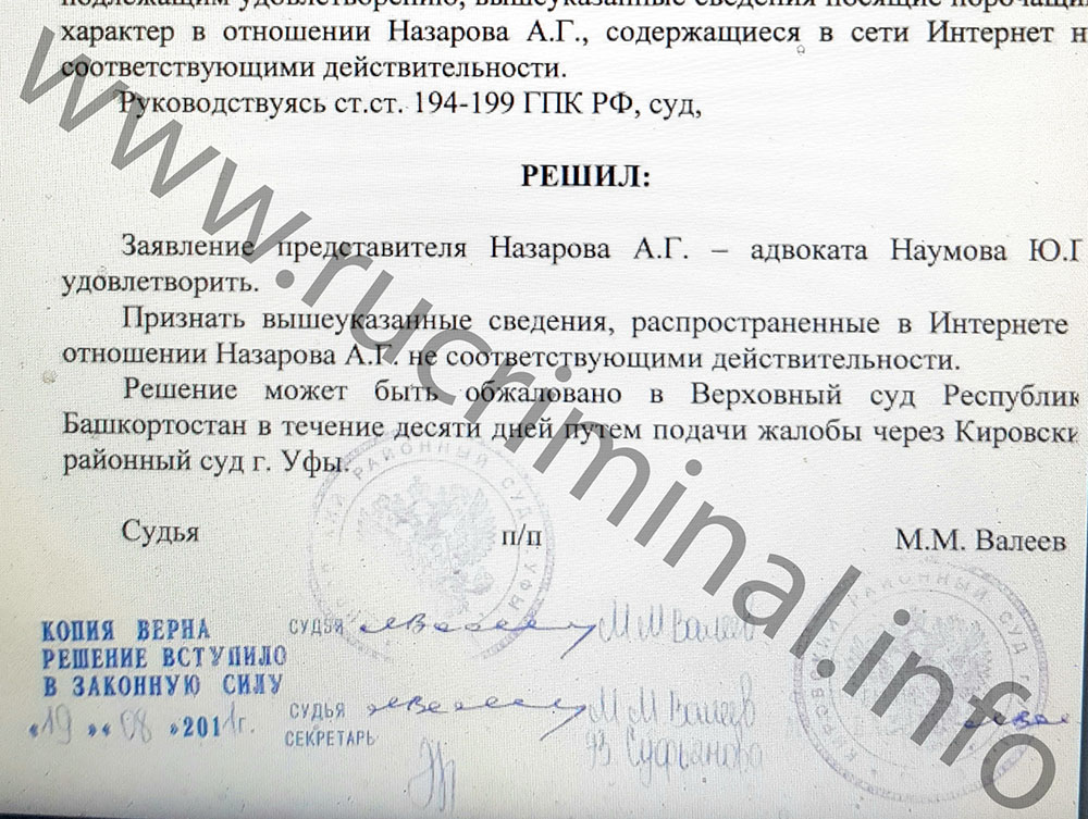 That's the whole explanation for the appearance of such a decision Valeev, with which Andrei Nazarov "cleans" the Internet. About other cases of cooperation Valeeva and the owner of "Graneli", rucriminal.info will tell in the following publications. As long as we move on to the contested arguments in this case.