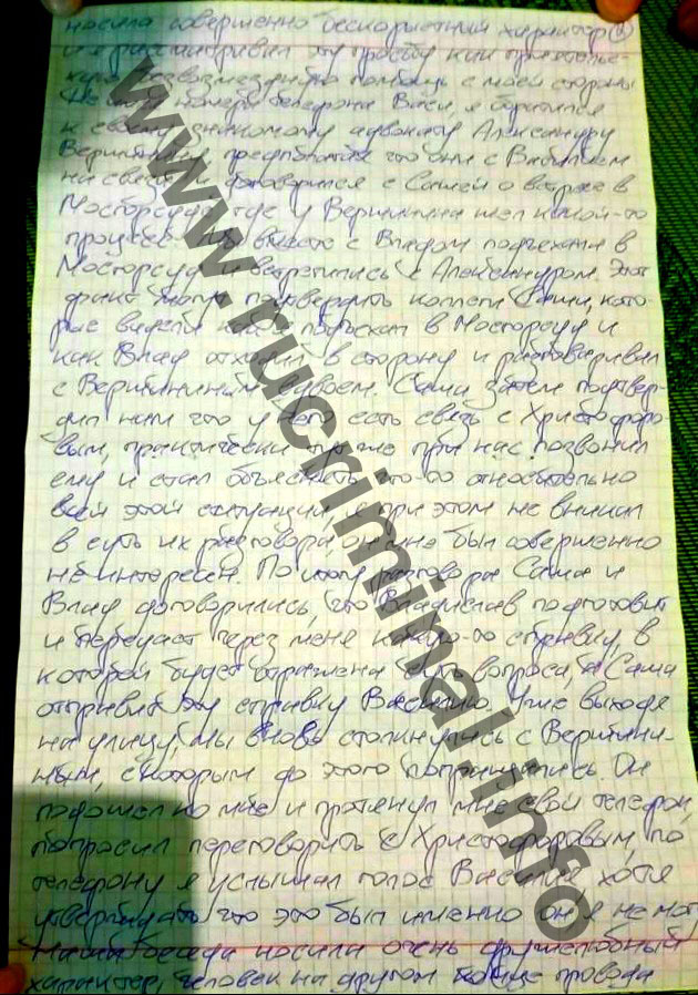 К Добрынину обратился Влад Шаповалов, который был опером в ГУУР. С ним познакомился в свое время, так как он является братом моего близкого друга Игоря Архипова. Шаповалов попросил найти выход на «вора в законе» Василия Христофорова (Вася Воскрес), с которым Добрынин был знаком. Шаповалов пояснил, что у него находится материал, который указывает на его криминальную деятельность и может послужить поводом для возбуждения уголовного дела пор статье 210.1 УК РФ (лидерство в преступном сообществе). Шаповалов пообещал, что в случае, если удастся найти общий язык с Христофоровым, то Шаповалов с бывшими коллегами действующими сотрудниками МВД РФ, смогут скорректировать ситуацию и у нее не будет серьезных последствий. Не имея номера телефона Воскреса, Добрынин обратился к старому знакомому адвокату Александру Вершинину, который среди прочего представлял интересы Христофорова. Добрынин встретился с Вершининым в Мосгорсуде, где тот был по «делу Аблязова». С Добрыниным поехал и Шаповалов, который с Дружиныным о чем то переговорили. Вершинин подтвердил, что на связи с Воскресом и сразу же позвонил ему. В результате договорились, что Шаповалов подготовит справку о ситуации с «вором в законе» и ее передадут Христофорову. На выходе из Мосгорсуда Вершинин передал Добрынину телефонную трубку, а на другом конце был «вор в законе». Воскрес поинтересовался деталями сложившейся ситуации, спросил откуда Шаповалов. Добрынин пояснил, что из ГУУР МВД РФ. Договорились, что Шаповалов передаст справку и Воскрес решит интересна ли ему ситуация. По уверению Добрынина, он все делал бескорыстно и считал, что на этом его миссия исчерпана.