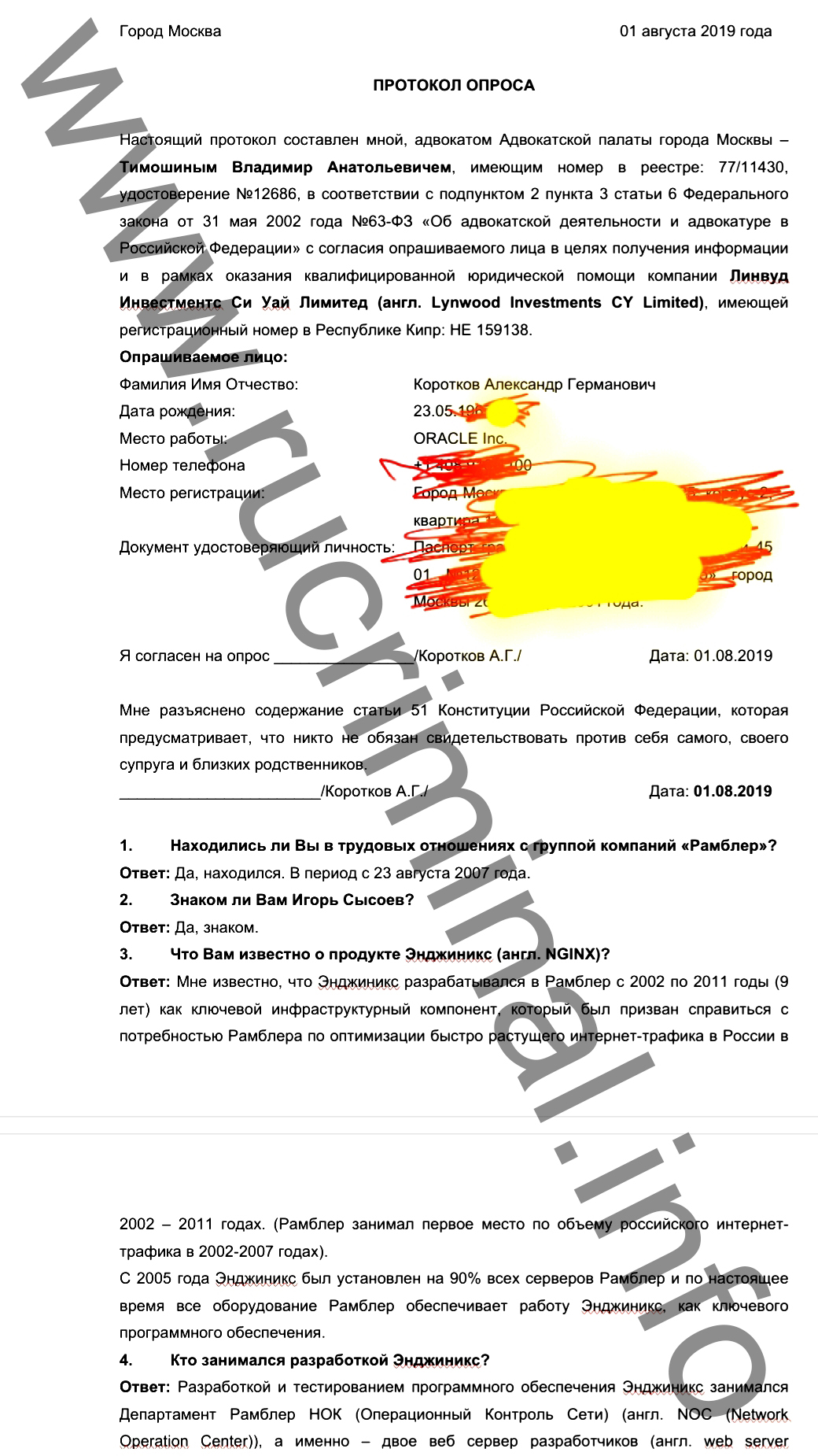 В результате состоялись переговоры с Lynwood Investments CY Ltd (бенефициаром считается сын Александра Мамута совладельца Rambler) , поскольку Rambler Group в 2015 г. уступила ей права на предъявление претензий и исков в разбирательствах с Nginx и были заключены следующие договоренности. Всей работой будет заниматься команда Ракишева-Калоева. Если Nginx удастся отжать, то он перейдет Ракишеву, а соответственно Lynwood Investments CY Ltd получит конкретную и весьма немалую сумму.