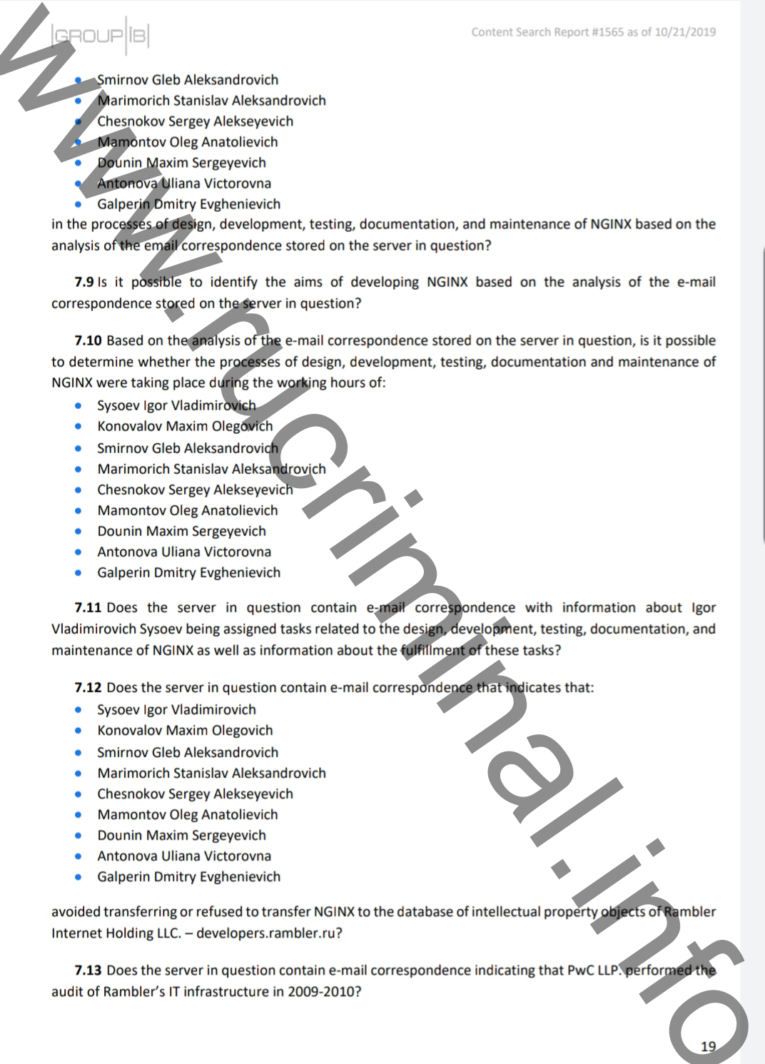 Владимир Тимошин, благодаря определенным очень личным отношениям, ногой открывает двери во многие кабинеты ГСУ ГУ МВД по Москве. Именно он договаривался о возбуждении дела, необходимого для захвата Nginx. Поскольку никаких оснований для возбуждения дела не было, его решили «слепить». Еще летом прошлого года Тимошин начал фабриковать необходимые материалы. Максимилиан Гришин по поручению Тимошина занимался составлением фиктивных опросов экс-сотрудников Rambler и т.д. Также адвокаты привлекли к своей работе Group-IB. Его сотрудники работали с сервером, на котором была вся внутренняя переписка Rambler за многие годы, а также «специалисты» Group-IB организовали доступ к личным ящикам создателей Nginx Игоря Сысоева и Максима Коновалова. В частности Group-IB сумело организовать доступ к переписке Сысоева и Коновалова с представителями PwC, IDelyne Group, Greycroft LL.C., Greyeroft Partners II LP., BV Capital VCC , Greenberg, Whitcombe & Takeuchi LLP., Runa Capital I. LP ,GlobTechFund. Вся эта работа щедро финансировалась Кенесом Ракишевым.