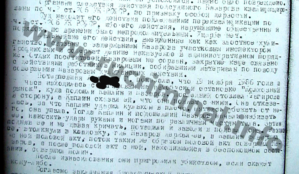 «Потерпевшая А. Г. показала, что 19 ноября 1986 года в 22 часа находилась с Тагировым на автобусной остановке «Колхозный рынок», куда подошли Каплин и Назаров. Последний отозвал Тагирова в сторону, а Каплин сказал ей, что она пойдет с ним. Она отказалась, за что Каплин ударил кулаком в плечо. Пытаясь убежать от него, она упала. Тогда Каплин и подошедший Назаров начали избивать ее, наносить удары руками и ногами по различным частям тела»,- говорится в приговоре, копией которого располагает rucriminal.info- «Затем подняв ее и не давая кричать, потащили и завели в подвал дома. Раздев ее, втолкнули в кладовку, где Назаров держал ее, а Каплин совершил с ней половой акт, потом таким же образом половой акт совершил Назаров, а после половой акт с ней, находившейся в беспомощном состоянии, совершил Полин. После изнасилования они пригрозили убийством, если скажет кому-либо». Эксперты зафиксировали у несовершеннолетней повреждения в виде кровоподтеков и ушибов мягких тканей, относящихся к разряду легких, повлекших за собой кратковременное расстройство здоровья.