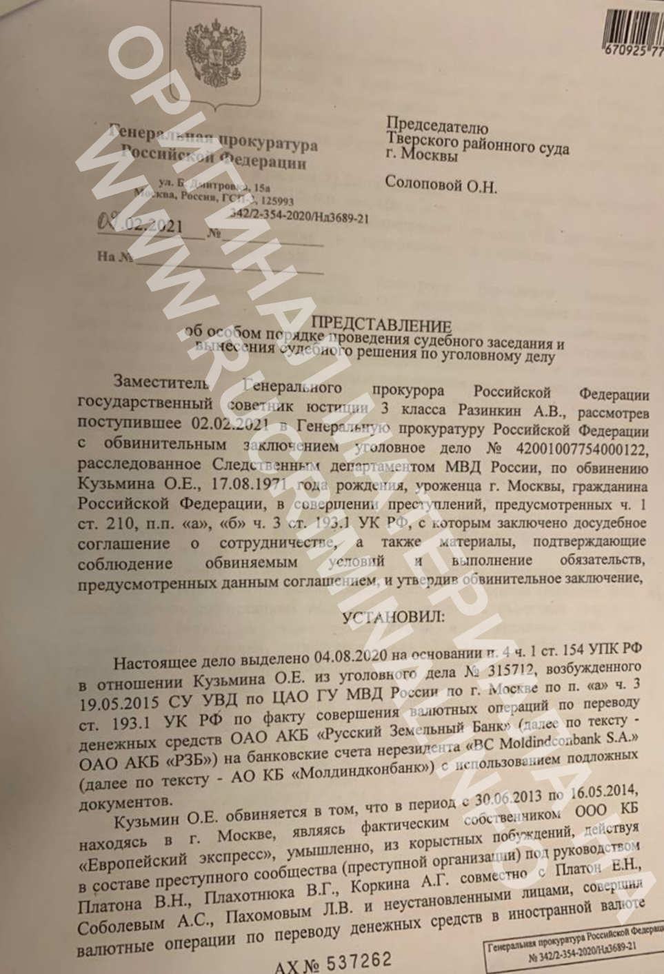 В Тверской суд Москвы поступили материалы дела в отношении экс-главы банка «Европейский экспресс» Олега Кузьмина. По данным телеграм-канала ВЧК-ОГПК, туда же поступило представление заместителя Генпрокурора Анатолий Разинкин о том, чтобы дело рассматривалось в особом порядке. В документе указано, что Кузьмин заключил сделку со следствием и выполнил все ее условия- назвал всех участников крупнейшего отмывочного канала Ландромат.